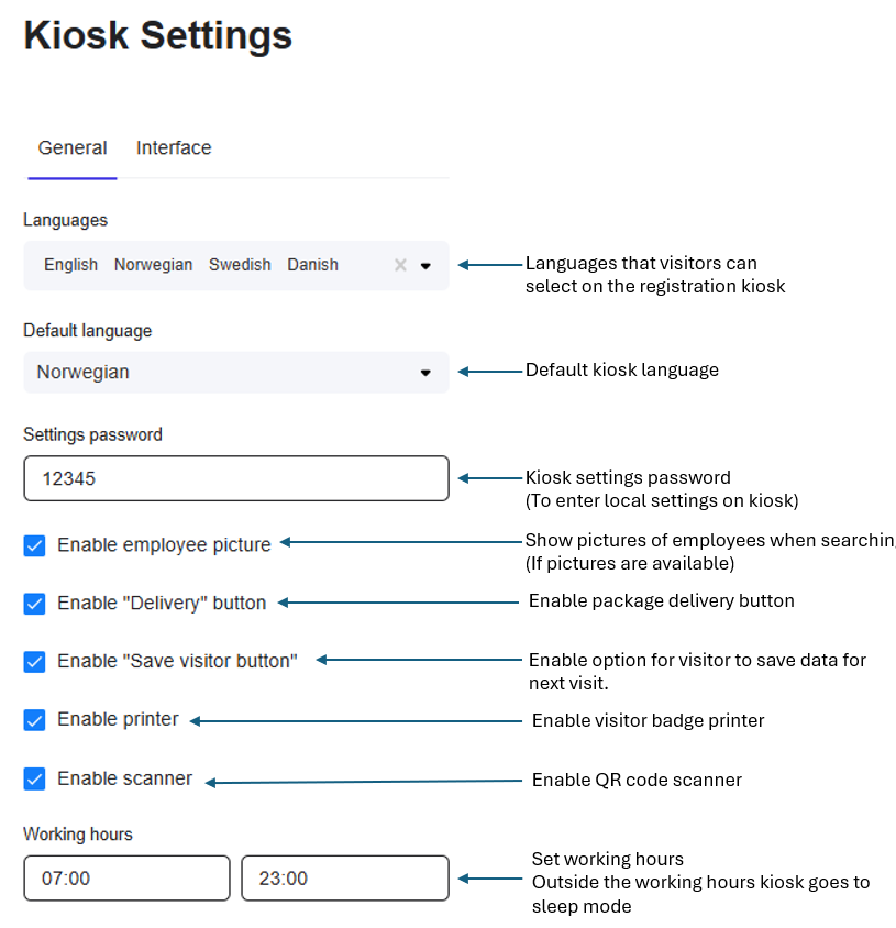 In menu item Kiosk Settings you set the default settings for all registration kiosks.