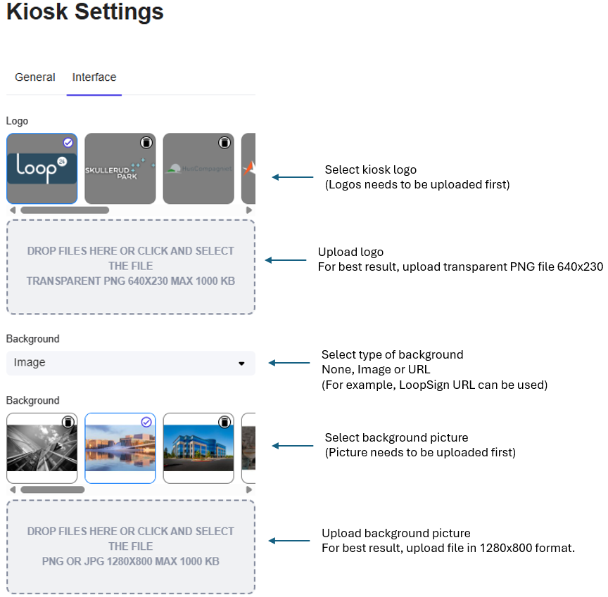 All kiosk settings can be induvidually set pr, kiosk under menu item “Kiosks”