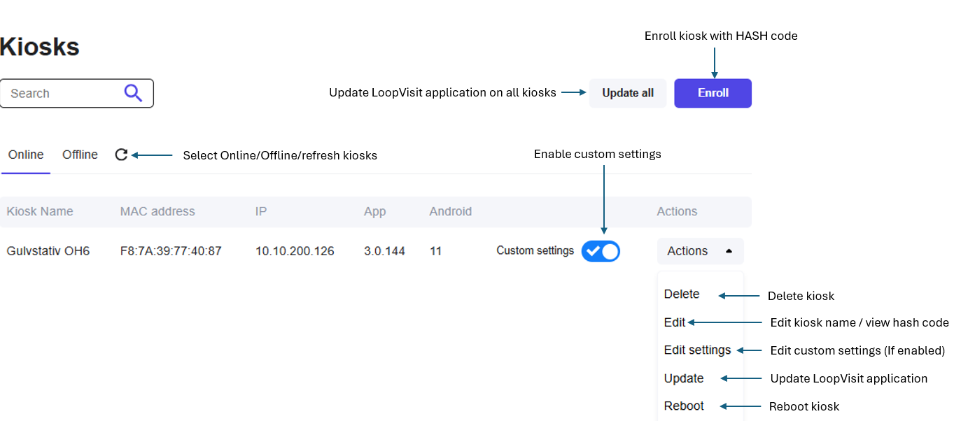 In menu item Kiosk the enrollment and custom settings for each kiosk is set.