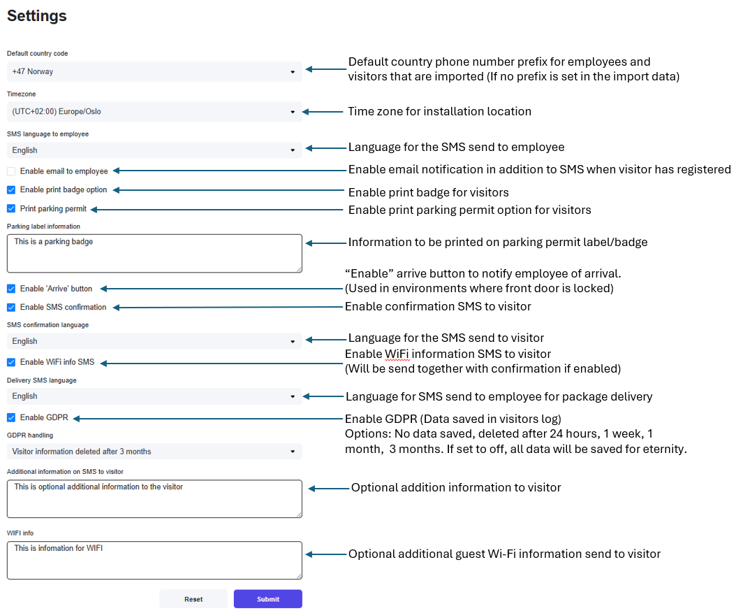 In menu item “Settings” the default settings for the solution. In addition all default settings for the tenant are set.