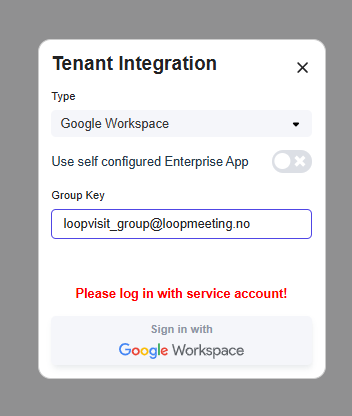 - Then select Integration type “Google Workspace” and enter the email adress for the group you created.